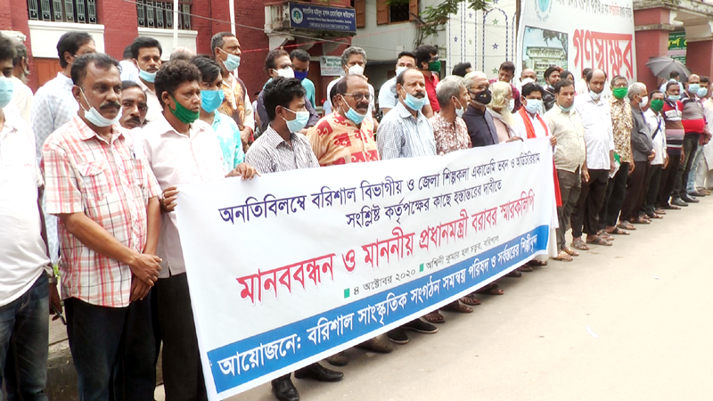 বরিশাল শিল্পকলা একাডেমি ভবনের দায়িত্ব হস্তান্তরের দাবীতে সাংস্কৃতি জনদের মানববন্ধন ও স্মারকলিপি প্রদান