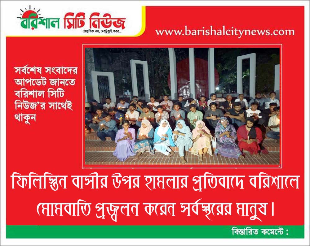 ফিলিস্তিন বাসীর উপর হামলার প্রতিবাদে বরিশাল কেন্দ্রীয় শহিদ মিনারে মোমবাতি প্রজ্বলন।