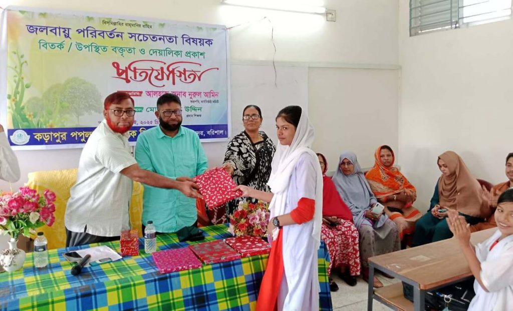 নিজস্ব প্রতিবেদক >> বরিশাল সদর উপজেলার রায়পাশা ইসলামিয়া মাধ্যমিক বিদ্যালয় কতৃক আয়োজিত জলবায়ু পরিবর্তন সচেতনতা বিষয়ক উপস্থিত বক্তৃতা ও দেয়ালিকা প্রকাশ প্রতিযোগিতা অনুষ্ঠিত হয়, বিজয়ীদের মধ্যে পুরস্কার বিতরণ করা হয়েছে।