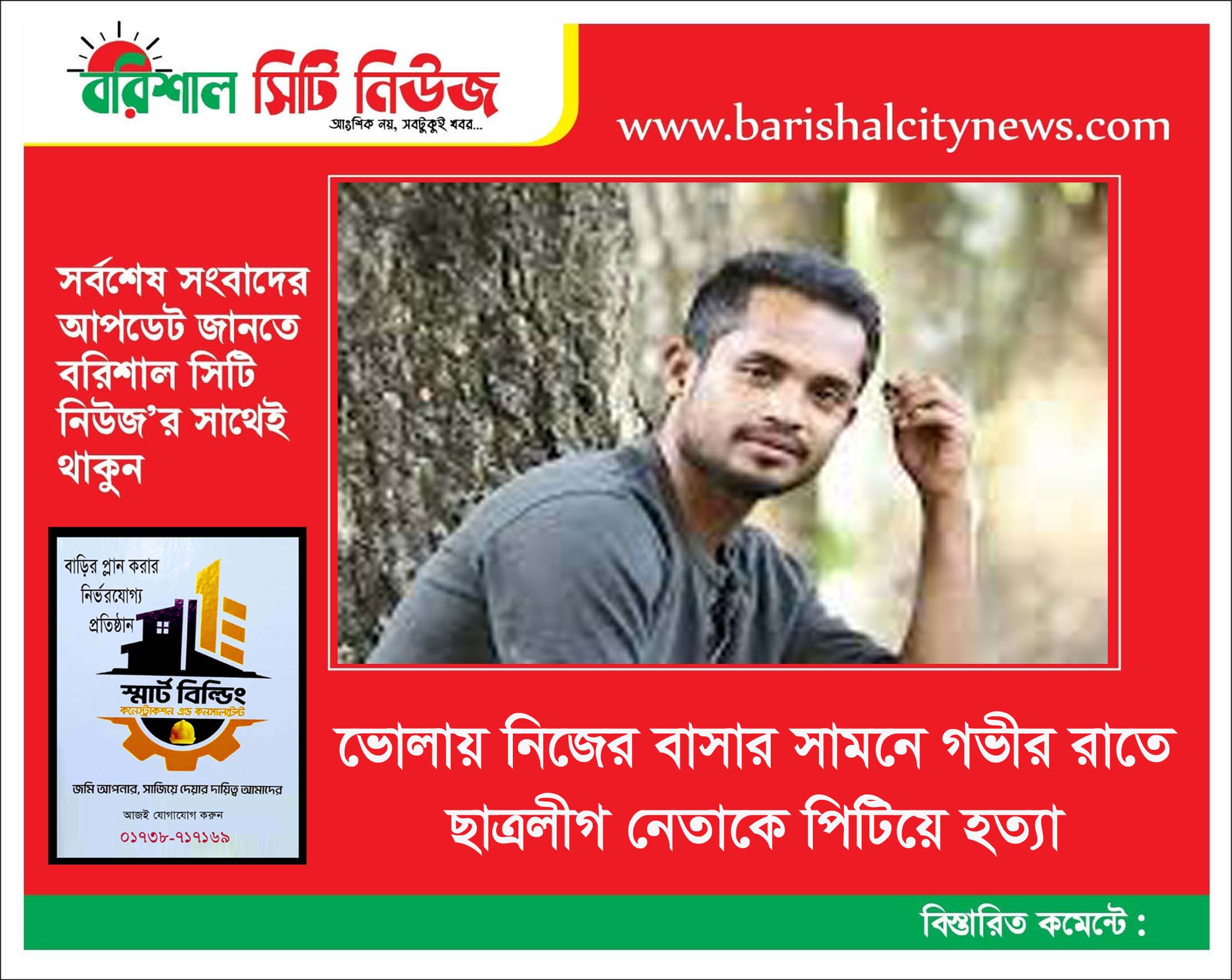 সিটি নিউজ ডেস্ক >> ভোলা সদর উপজেলা ছাত্রলীগের সহ-সভাপতি মো: সাইফুল্লাহ আরিফকে (৩০) পিটিয়ে হত্যা করেছে দুর্বৃত্তরা। শুক্রবার দিবাগত রাতে ভোলা পৌরসভার কালিবাড়ী সড়ক এলাকার নববী মসজিদসংলগ্ন গলিতে তাঁর নিজের বাসার সামনে এ ঘটনা ঘটে।